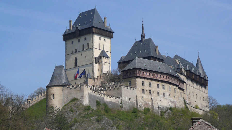 W odległości 30 km od Pragi leży Zamek Karlsztejn, którego budowa rozpoczęła się w 1348 roku. Zbudowano go w celu ochrony klejnotów koronnych Królestwa Czeskiego i Świętej Rzeszy Rzymskiej, zamek pełnił również funkcję obronną i reprezentacyjną. Sam zamek został zbudowany według struktury schodowej, jego najwyższym punktem jest Wielka Wieża z kaplicą św. Krzyża, w której przechowywano klejnoty koronacyjne.